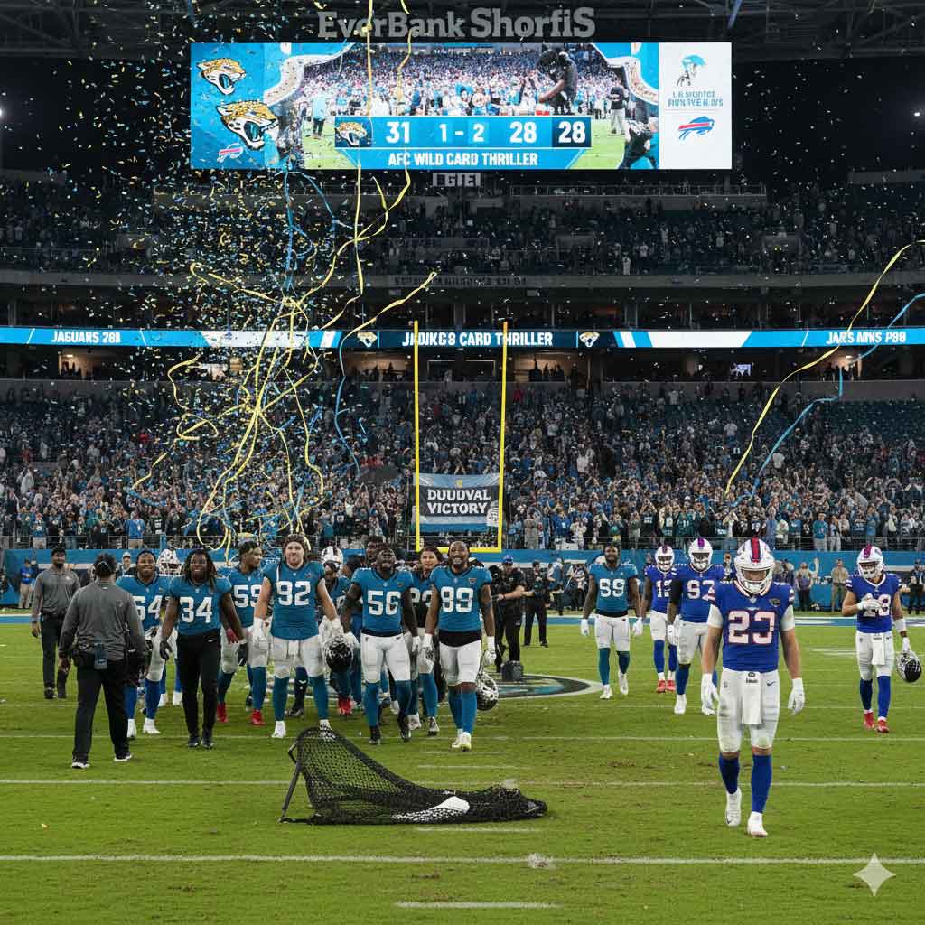 JACKSONVILLE, FL — In a game that lived up to its billing as the marquee matchup of the NFL Wild Card weekend, the Jacksonville Jaguars overcame a sluggish start and a legendary performance from Josh Allen to defeat the Buffalo Bills in a 31-28 nail-biter at EverBank Stadium. The victory extends Jacksonville’s franchise-best winning streak to nine games and marks a triumphant playoff debut for rookie head coach Liam Coen.