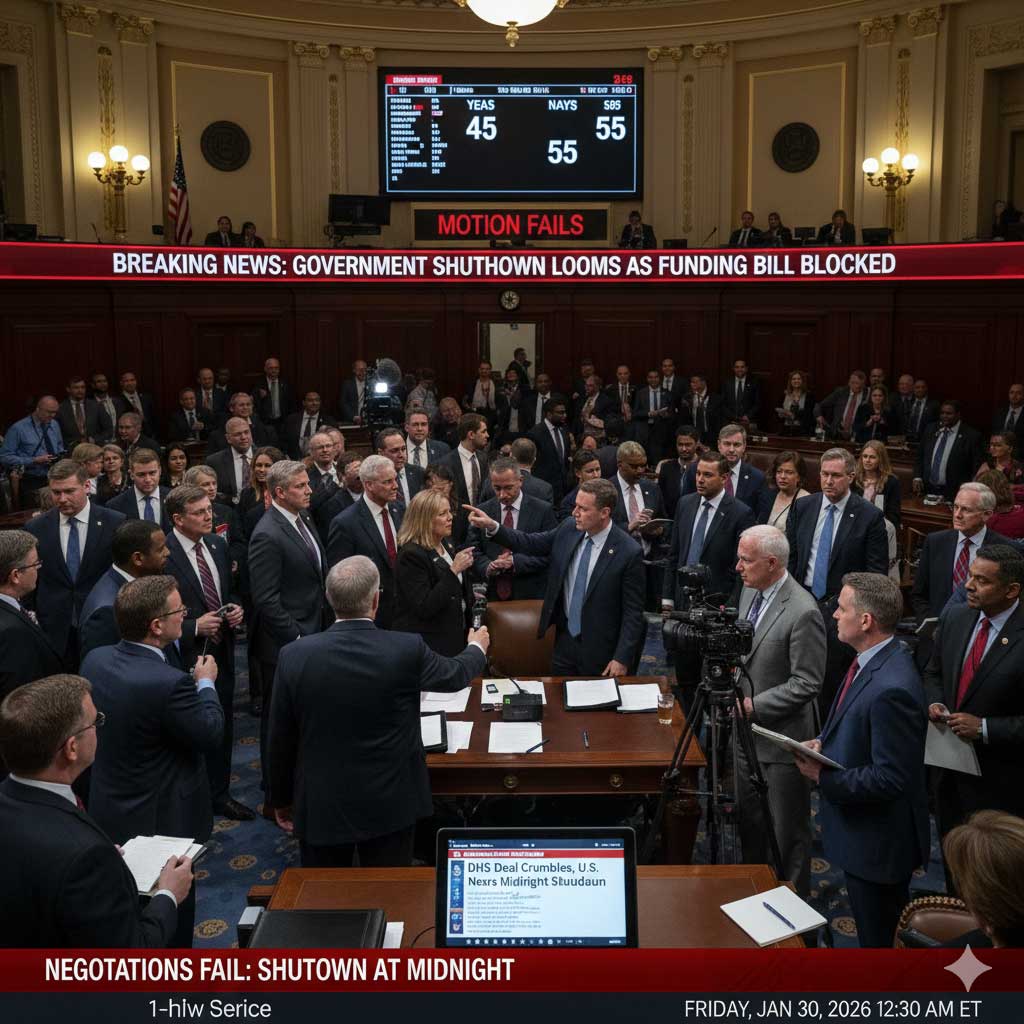 WASHINGTON, D.C. — The United States is hurtling toward a partial government shutdown at 11:59 p.m. Friday after a high-stakes effort to advance a $1.2 trillion funding package collapsed on the Senate floor Thursday. In a defiant 45-55 vote, a coalition of Senate Democrats and a surprising bloc of Republicans blocked the measure, signaling a total breakdown in negotiations between President Trump and congressional leaders over the administration’s aggressive immigration enforcement tactics.